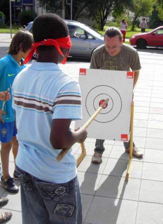 Auf jeden Fall hatten die Kinder viel Spaß beim „Zielscheibenspiel“ der SPD Remseck auf dem Pattonviller Straßenfest am vergangenen Samstag. Und dieses Zielscheibenspiel war gar nicht so einfach wie zuerst alle dachten. Einen Stab in die Hand nehmen und die Zielscheibe anpeilen. Als jedoch dann die Augen verbunden waren und die Kinder auf die Scheibe loslaufen sollten, waren die Unsicherheiten sehr groß. Und so geschah es öfters, dass der Stab neben der Scheibe landete. Aber man durfte sich ja erneut in der Reihe anstellen und es noch mal probieren. Und jedem Kind, welches die Zielscheibe getroffen hatte war ein Eis aus der Kühltruhe von Jörg Kemper sicher. Und so waren es sehr viele Kinder die sich für ein Eis und einen Sachpreis die Augen verbinden ließen. Jonas Niemann, Stefan Eisenmann und Kurt Goldmann wiesen die Kinder ein, verbanden die Augen mit einem Tuch, überwachten den Zielstoß und gaben die Geschenke aus. Aber auch die Mitglieder des Gemeinderats Angelika Feurer, Heinz Layher und Rudi Schrödel ließen es sich nicht nehmen am SPD-Schirm oder direkt bei den Besucherinnen und Besuchern an den Biertischen ein Gespräch zu führen.